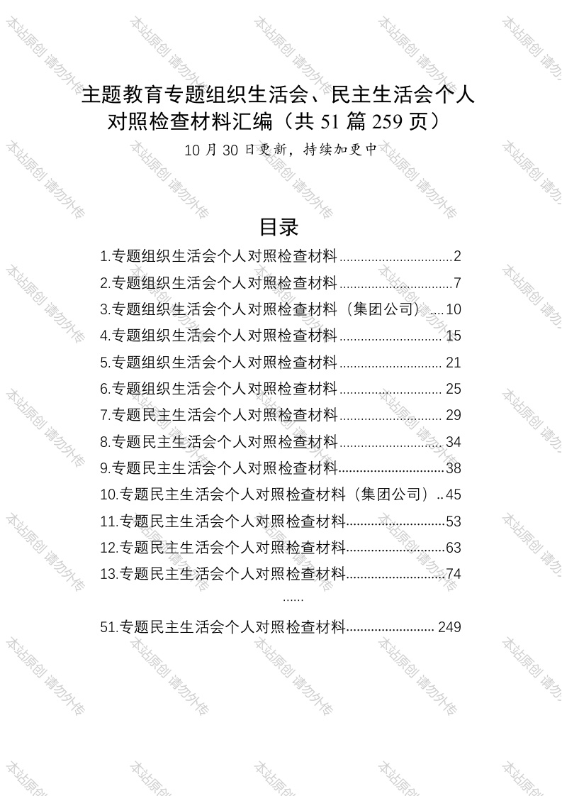 本站原创请勿本站原创请勿本站原创请勿本站原创请勿对照检查材料汇编(共51篇259页)本站原创请勿外传本站原创请勿外传原创请勿外传目录1.专题组织生活会个人对照检查材料2本站原创请勿外传2.专题组织生活会个人对照检查材料3.专题组织生活会个人对照检查材料(集团公司).104,专题组织生活会个人对照检查材料155.专题组织生活会个人对照检查材料216,专题组织生活会个人对照检查材料25本站原创请勿外传7专题民主生活会个人对照检查材料298.专题民主生活会个人对照检查材料349.专题民主生活会个人对照检查材料3810.专题民主生活会个人对照检查材料(集团公司).45本站原创请勿外传11.专题民主生活会个人对照检查材料.,5312.专题民主生活会个人对照检查材料.6313.专题民主生活会个人对照检查材料7451.专题民主生活会个人对照检查材料.…249本站原创请勿外传本站原创请勿外传本站原创请勿外传本站原创请勿外传本站原创请勿本站原合