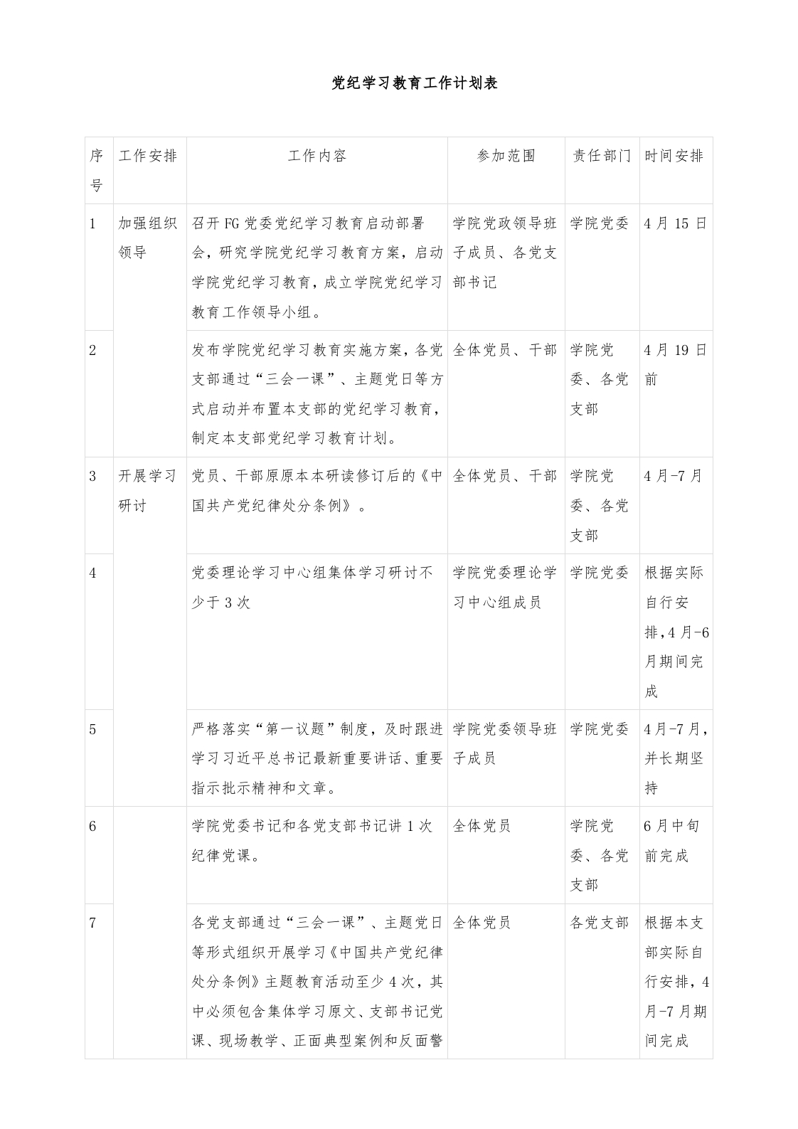 党纪学习教育工作计划表