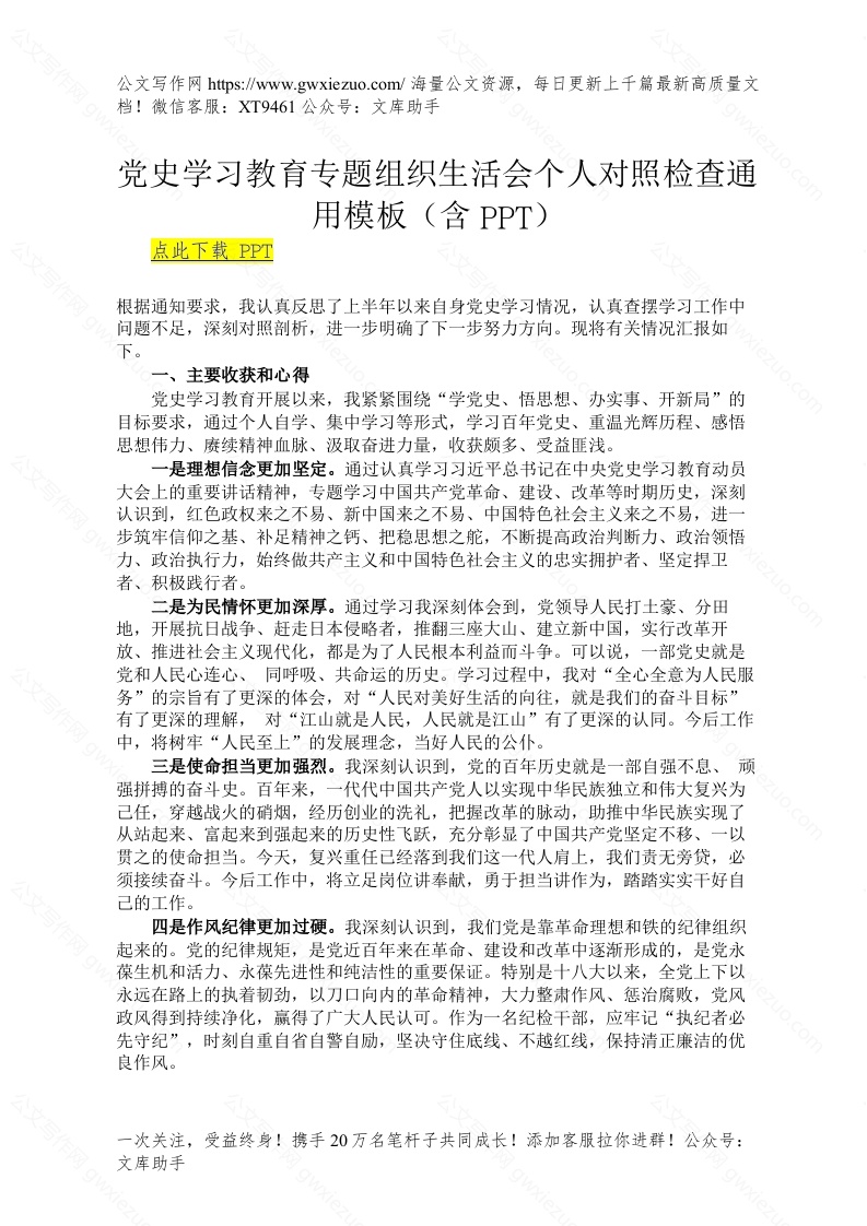 党史学习教育专题组织生活会个人对照检查通用模板(含PPT)