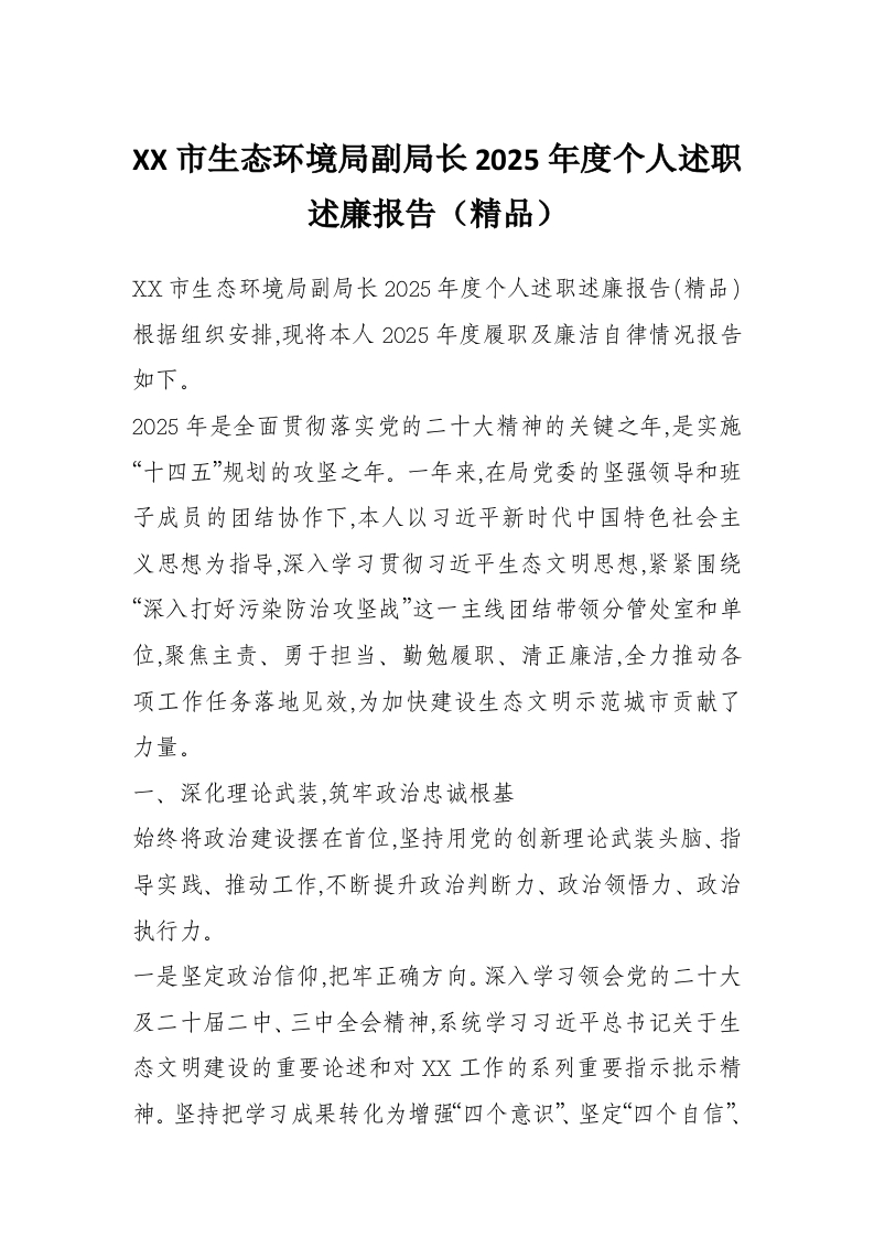 XX市生态环境局副局长2025年度个人述职述廉报告(精品)