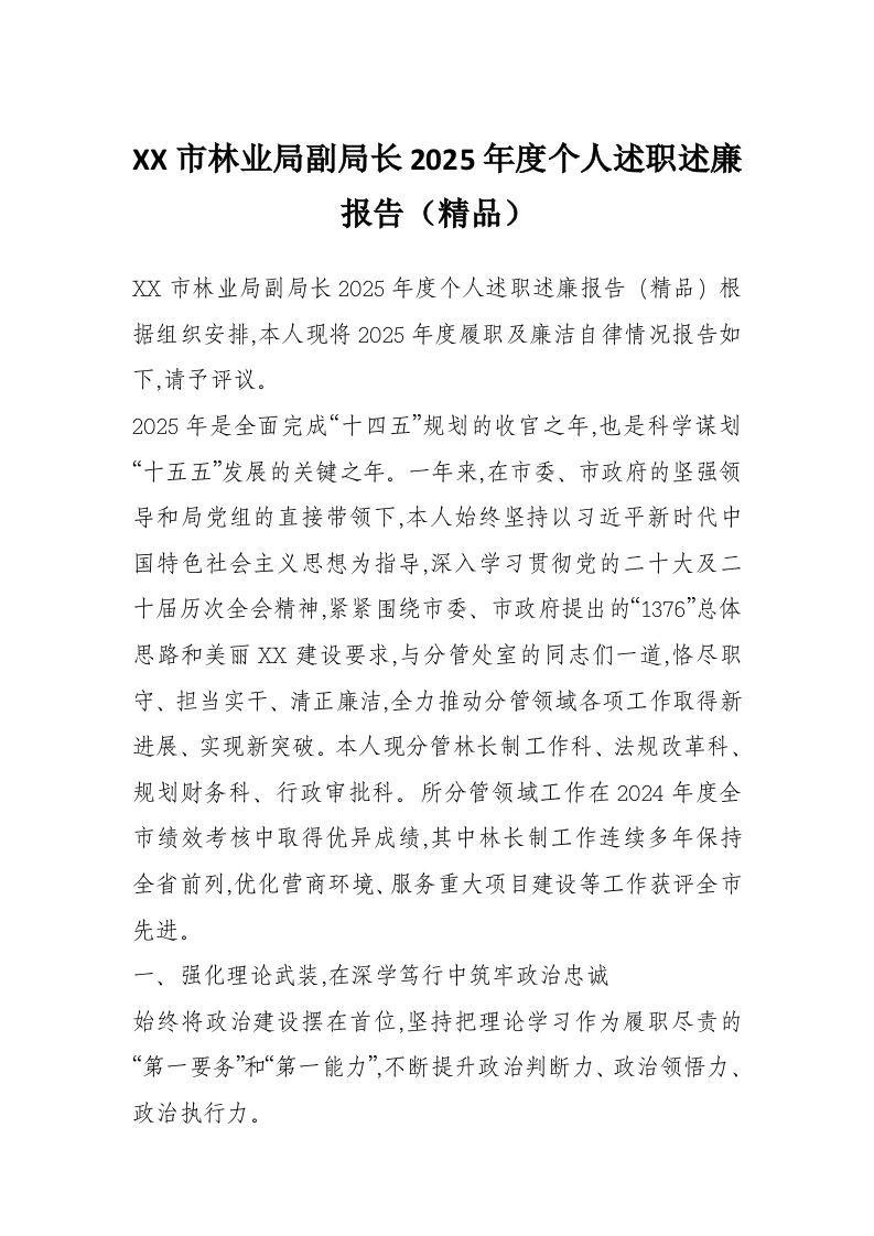 XX市林业局副局长2025年度个人述职述廉报告(精品)