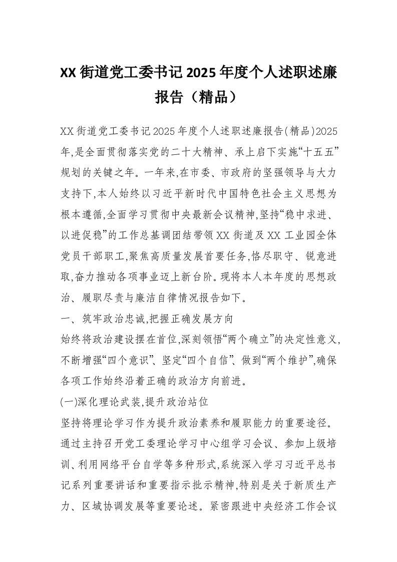 XX街道党工委书记2025年度个人述职述廉报告(精品)