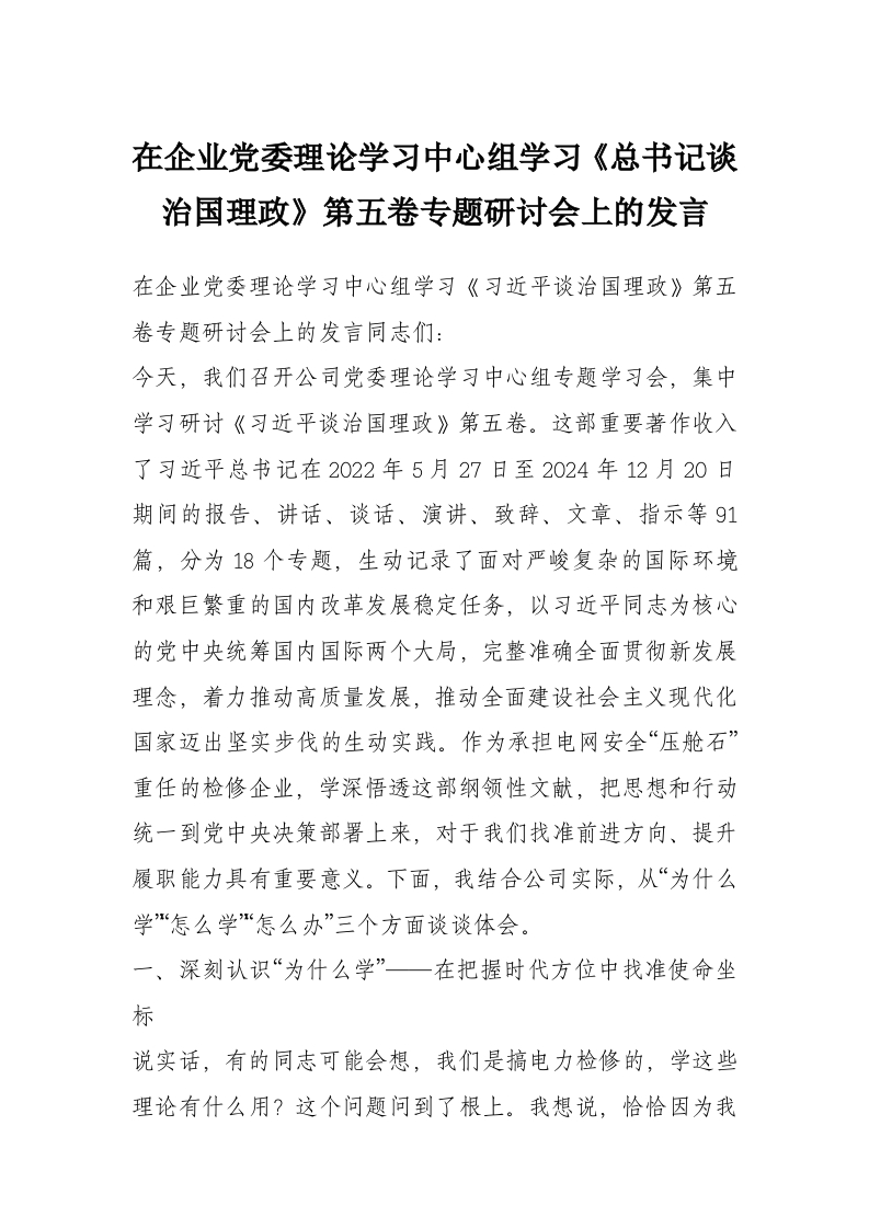 首页材料汇编在企业党委理论学习中心组学习《总书记谈治国理政》第五卷专题研讨会上的发言