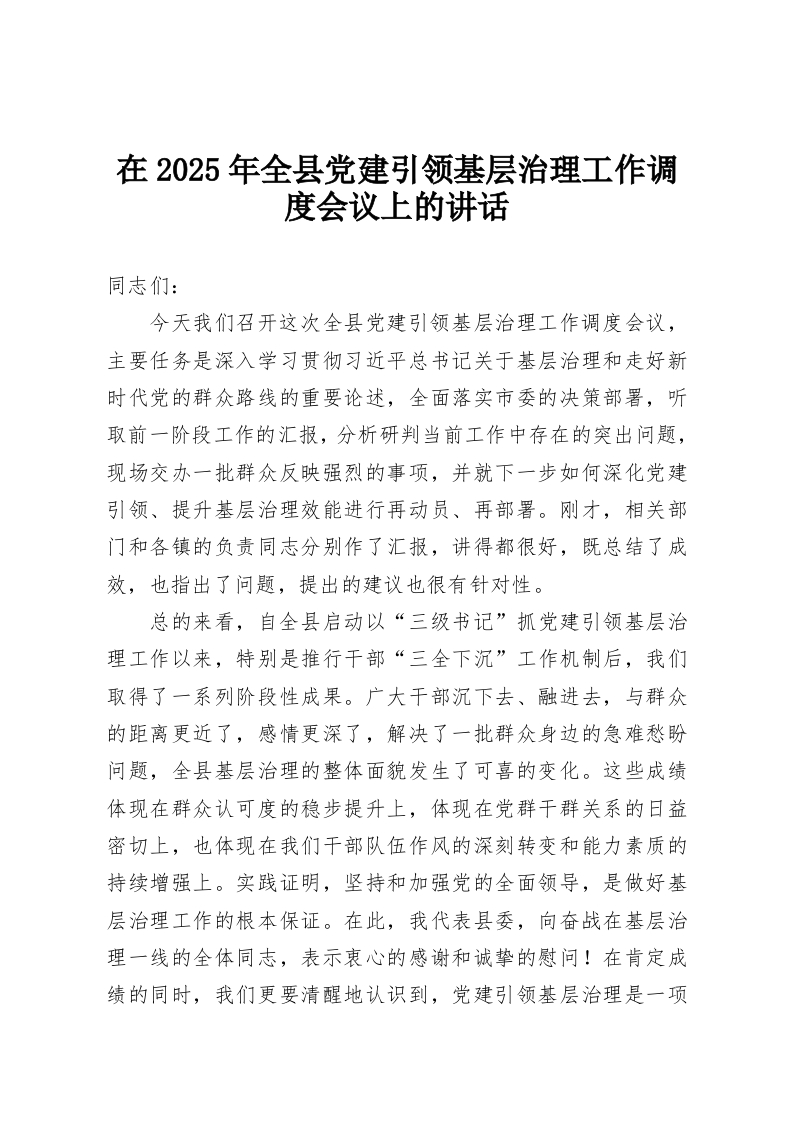在2025年全县党建引领基层治理工作调度会议上的讲话