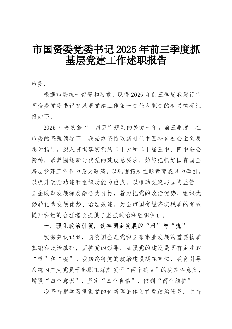 市国资委党委书记2025年前三季度抓基层党建工作述职报告