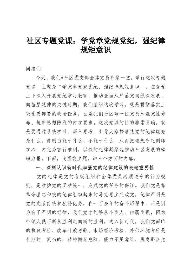 社区专题党课:学党章党规党纪,强纪律规矩意识