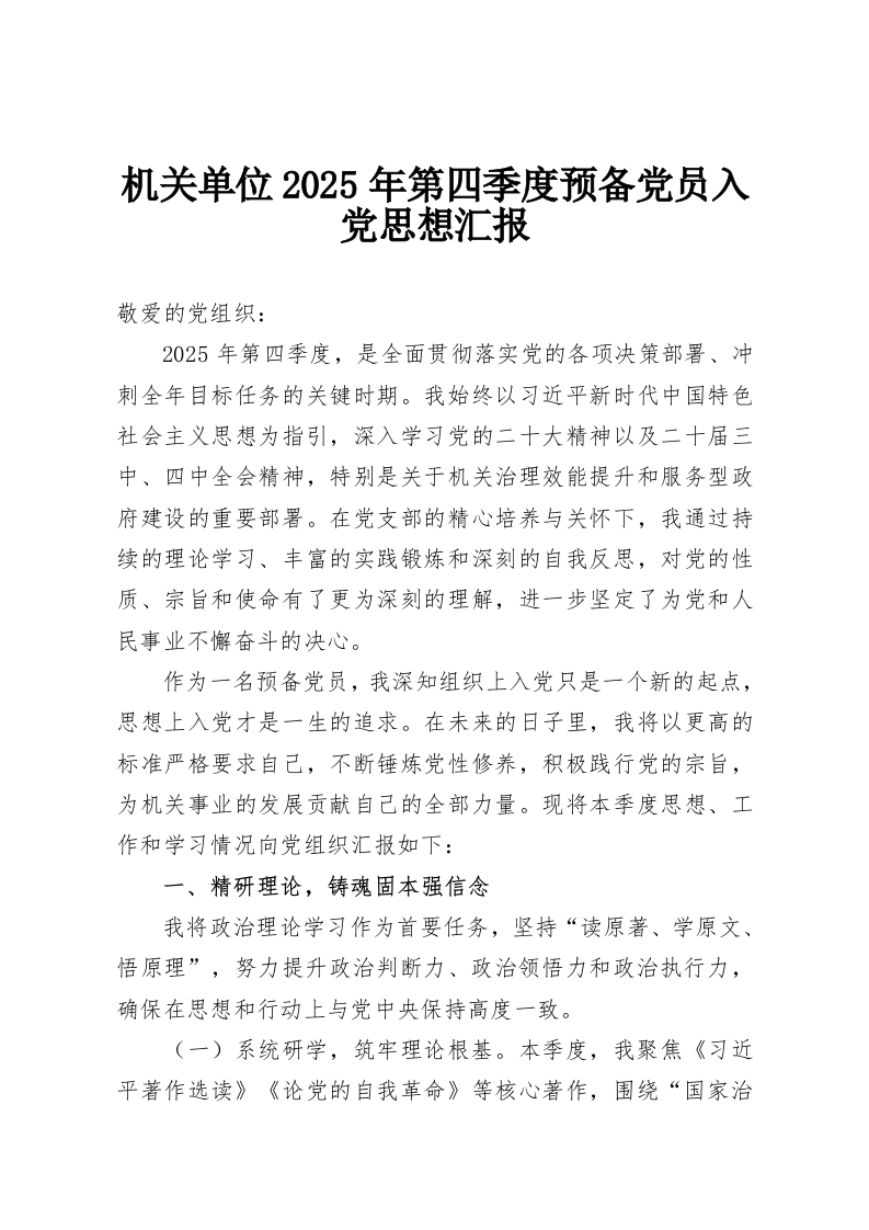 机关单位2025年第四季度预备党员入党思想汇报