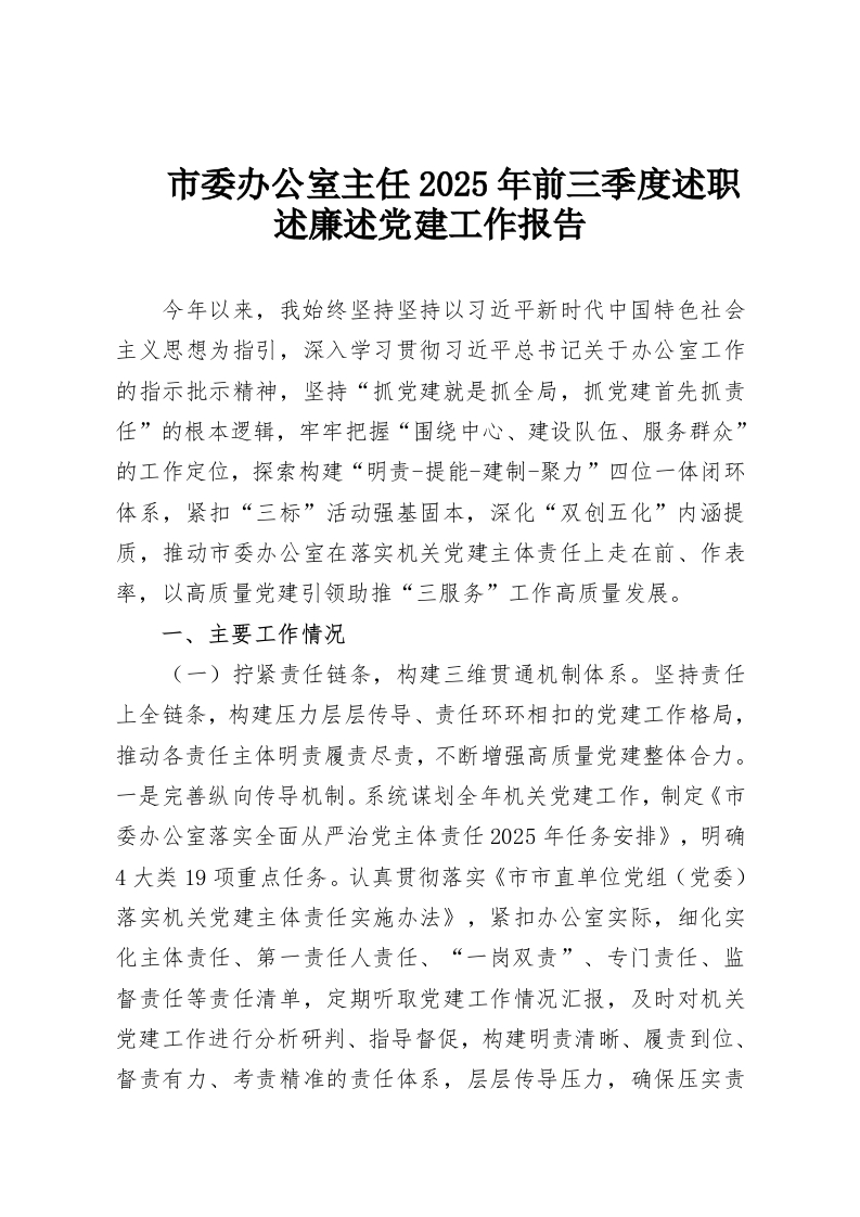 市委办公室主任2025年前三季度述职述廉述党建工作报告