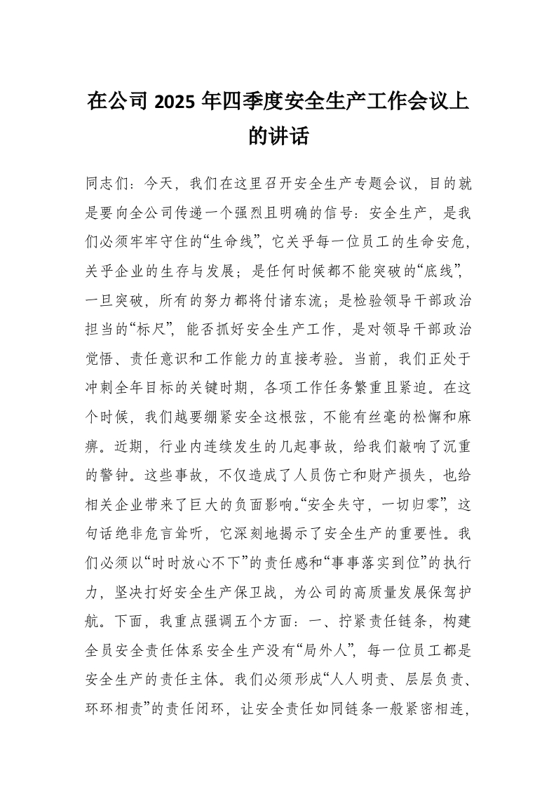 在公司2025年四季度安全生产工作会议上的讲话