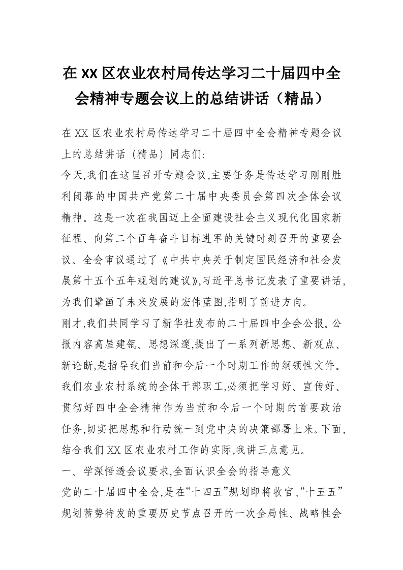 在XX区农业农村局传达学习二十届四中***精神专题会议上的总结讲话(精品)