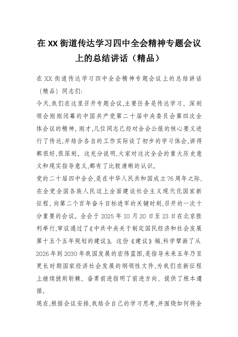 在XX街道传达学习四中***精神专题会议上的总结讲话(精品)
