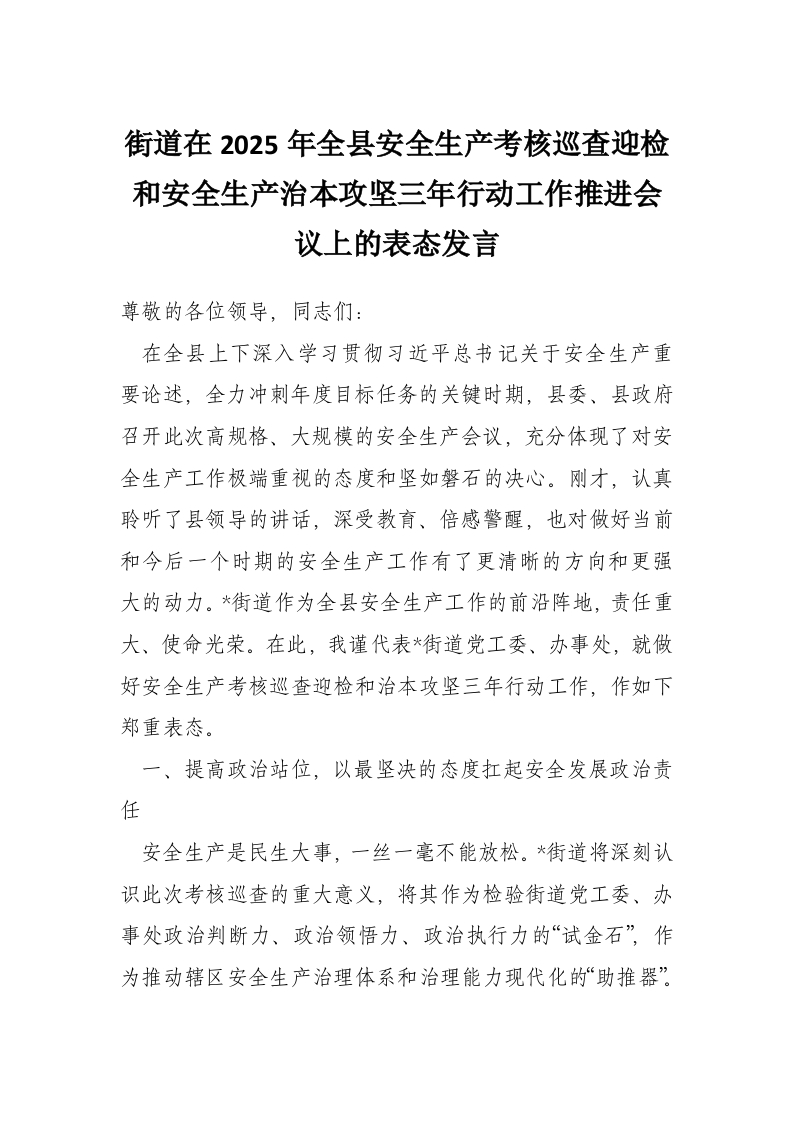 街道在2025年全县安全生产考核巡查迎检和安全生产治本攻坚三年行动工作推进会议上的表态发言