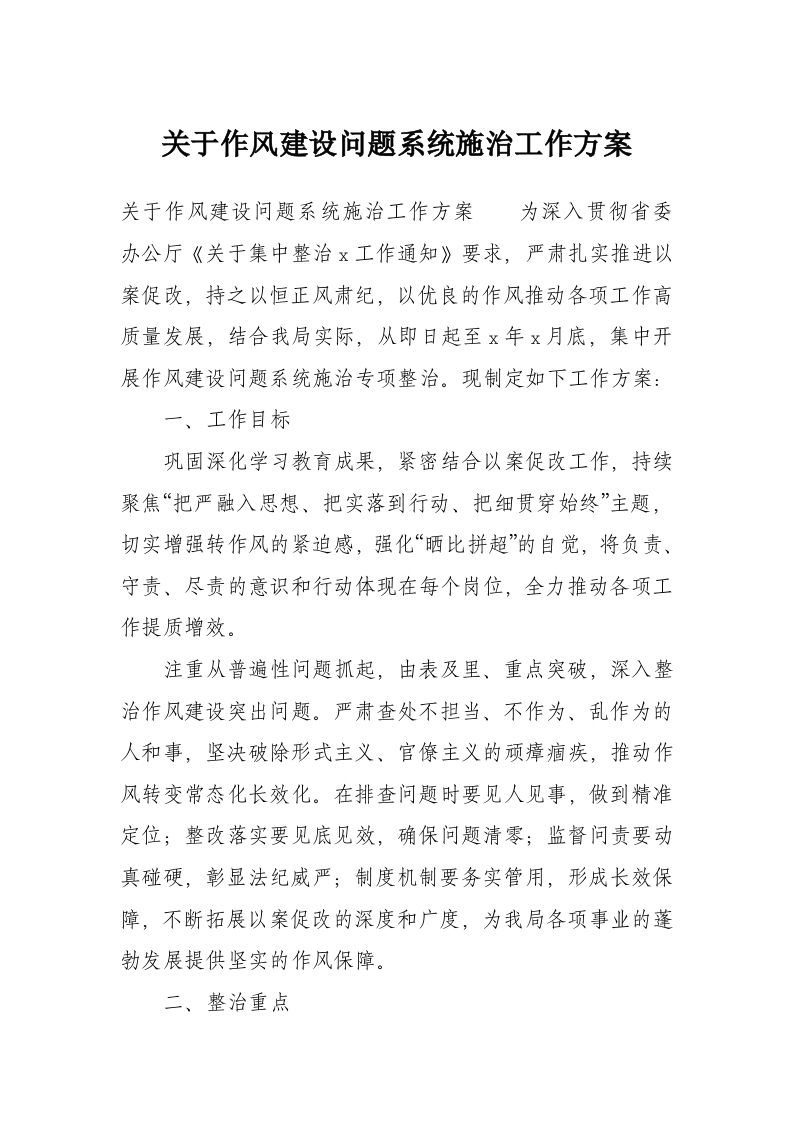 关于作风建设问题系统施治工作方案