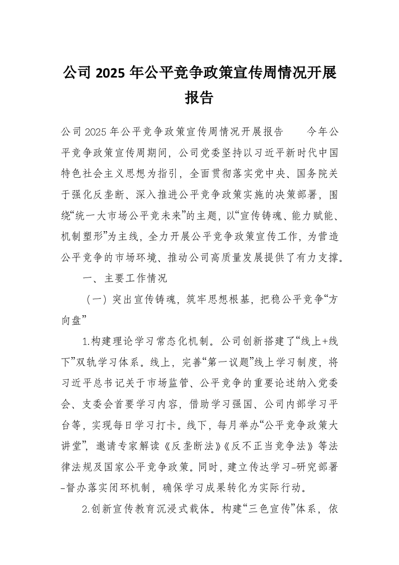 公司2025年公平竞争政策宣传周情况开展报告