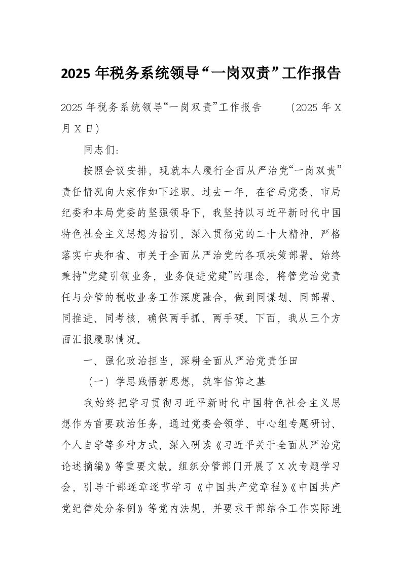 首页学习提升2025年税务系统领导“一岗双责”工作报告