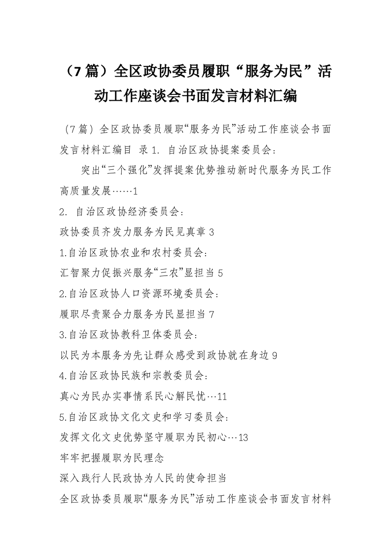 首页材料汇编(7篇)全区政协委员履职“服务为民”活动工作座谈会书面发言材料汇编