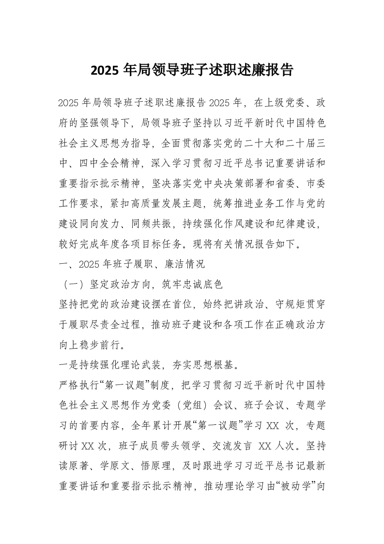 首页讲课讲稿2025年局领导班子述职述廉报告