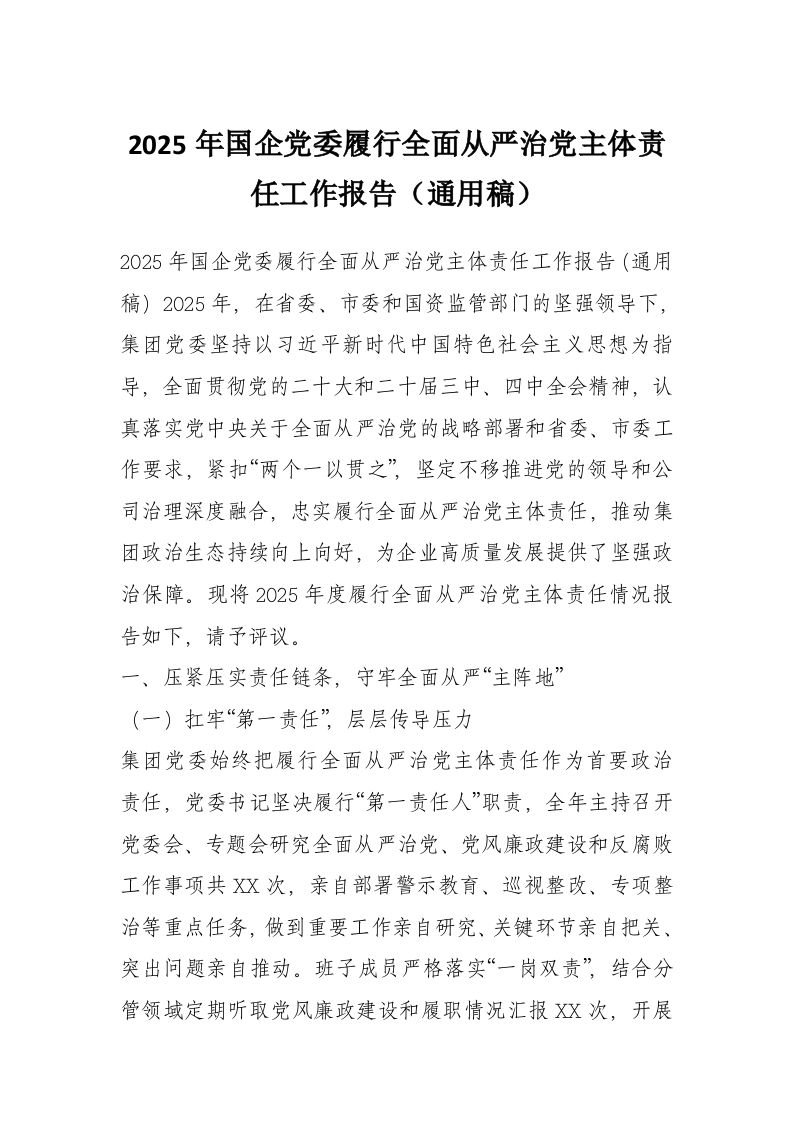 首页讲课讲稿2025年国企党委履行全面从严治党主体责任工作报告(通用稿)