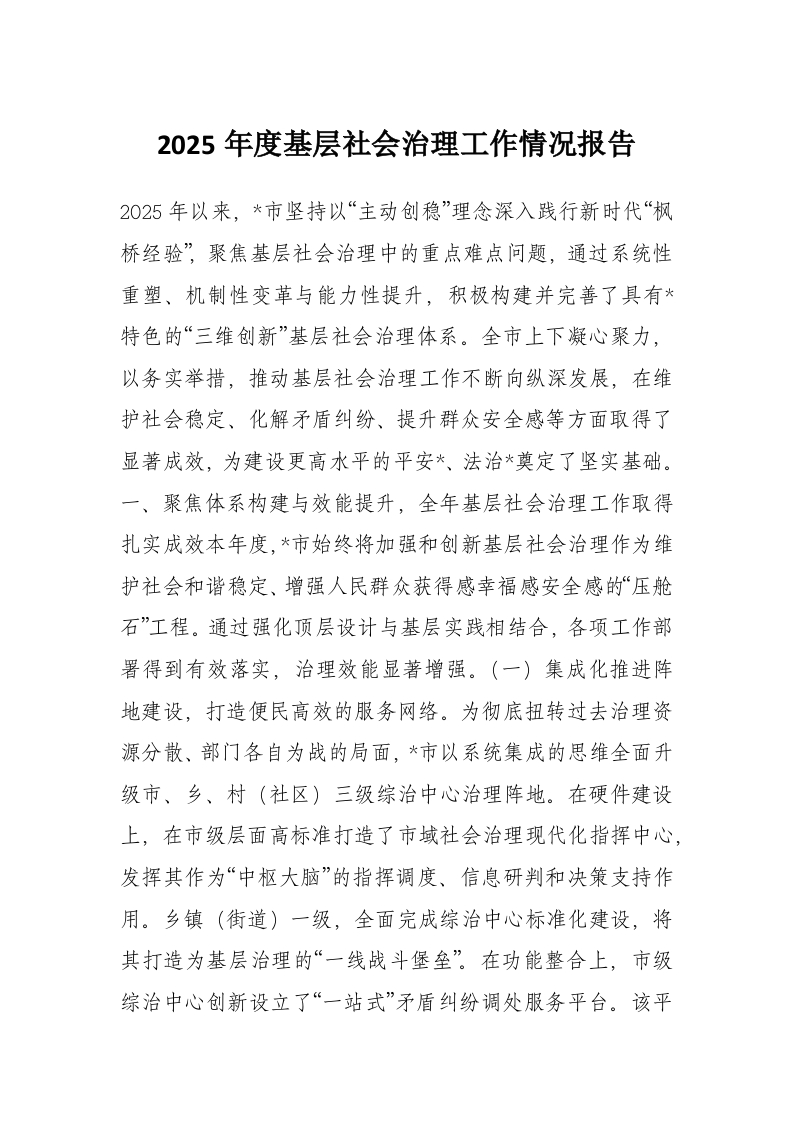 首页讲课讲稿2025年度基层社会治理工作情况报告
