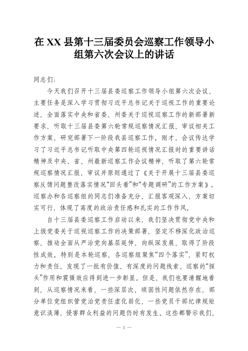 在XX县第十三届委员会巡察工作领导小组第六次会议上的讲话