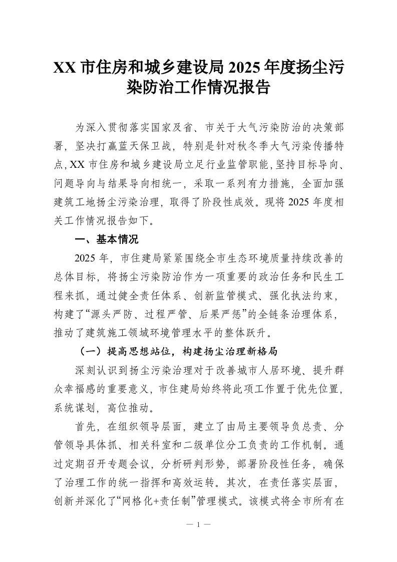XX市住房和城乡建设局2025年度扬尘污染防治工作情况报告