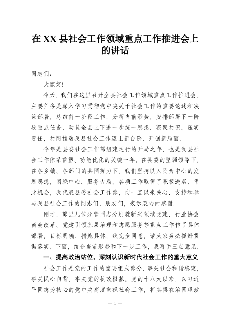 首页工作文档在XX县社会工作领域重点工作推进会上的讲话