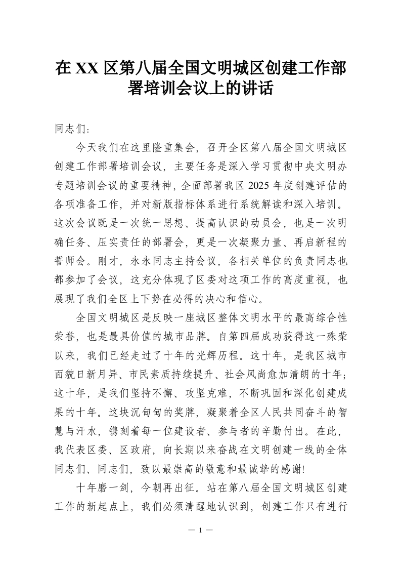 在XX区第八届全国文明城区创建工作部署培训会议上的讲话