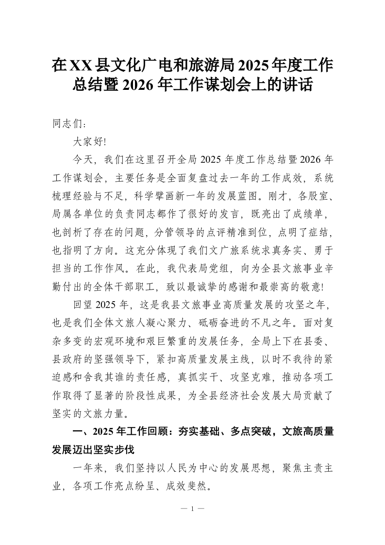 在XX县文化广电和旅游局2025年度工作总结暨2026年工作谋划会上的讲话