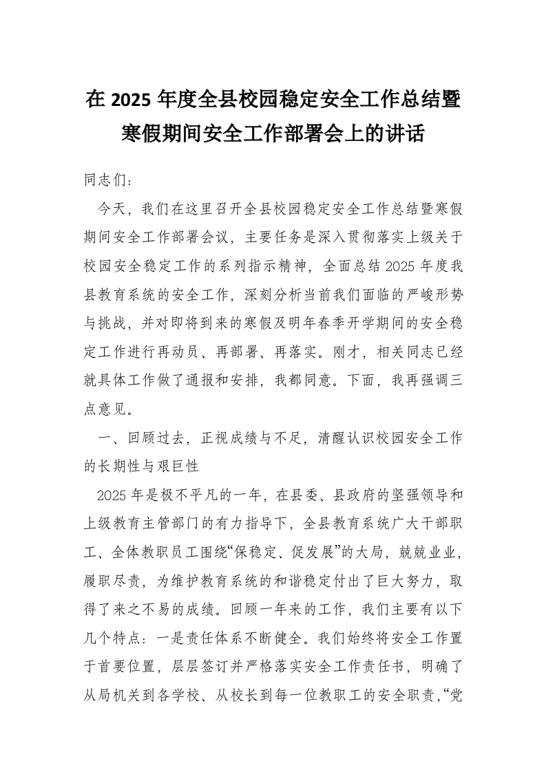 在2025年度全县校园稳定安全工作总结暨寒假期间安全工作部署会上的讲话