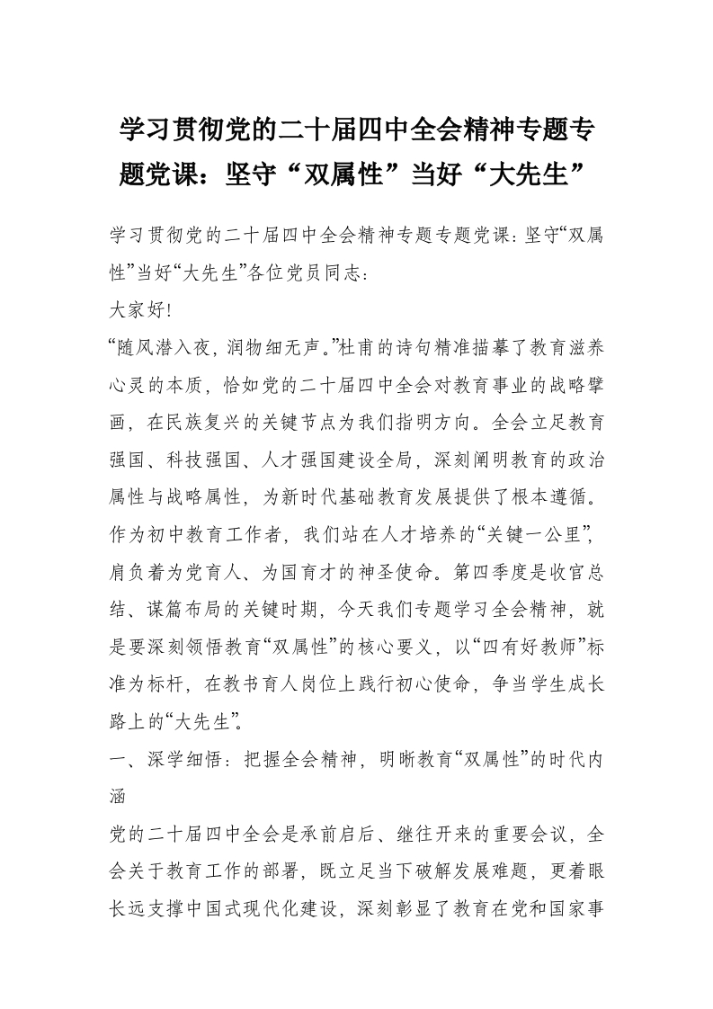 学习贯彻党的二十届四中***精神专题专题党课:坚守“双属性”当好“大先生”