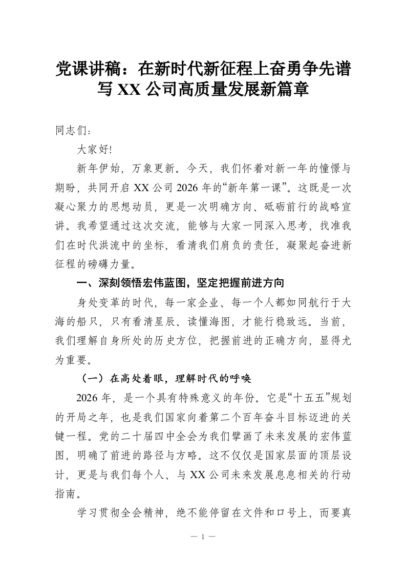 党课讲稿:在新时代新征程上奋勇争先谱写XX公司高质量发展新篇章