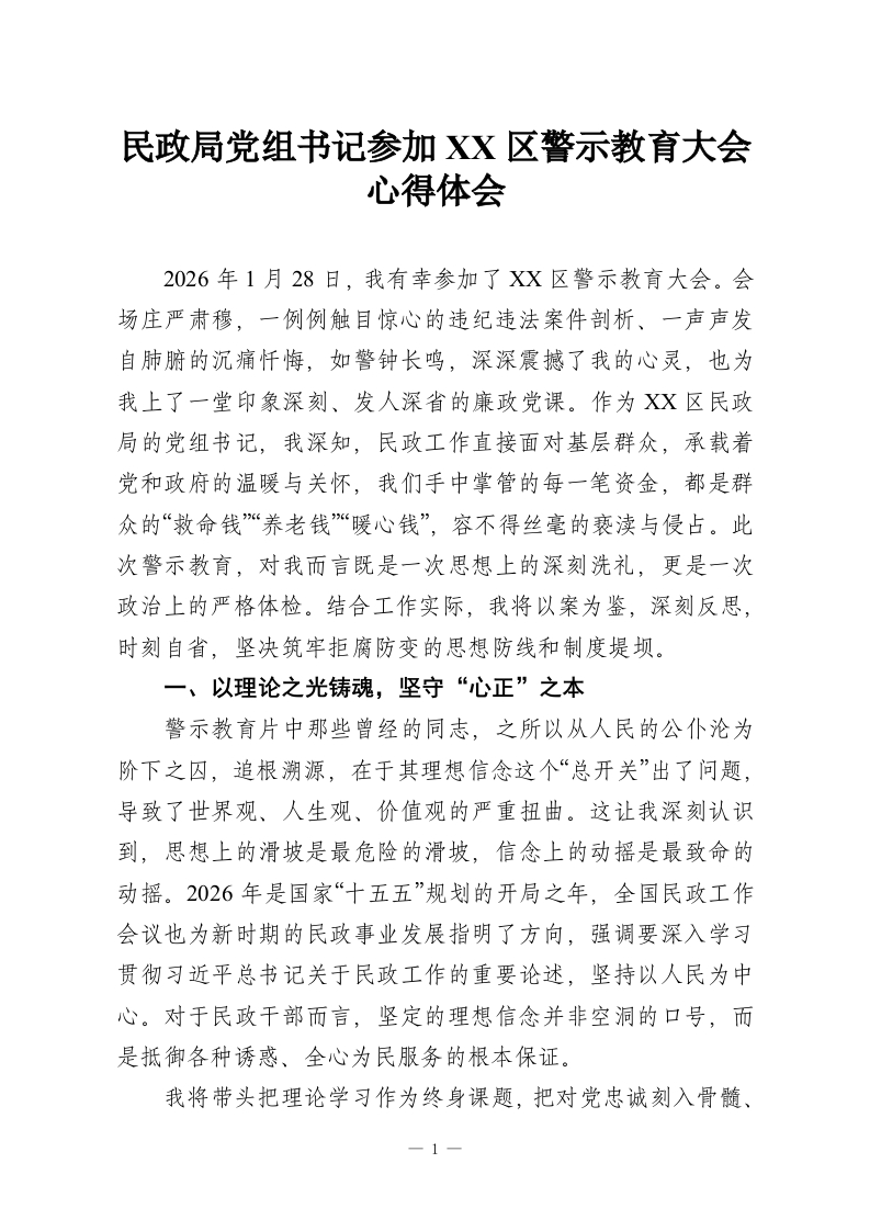 民政局党组书记参加XX区警示教育大会心得体会