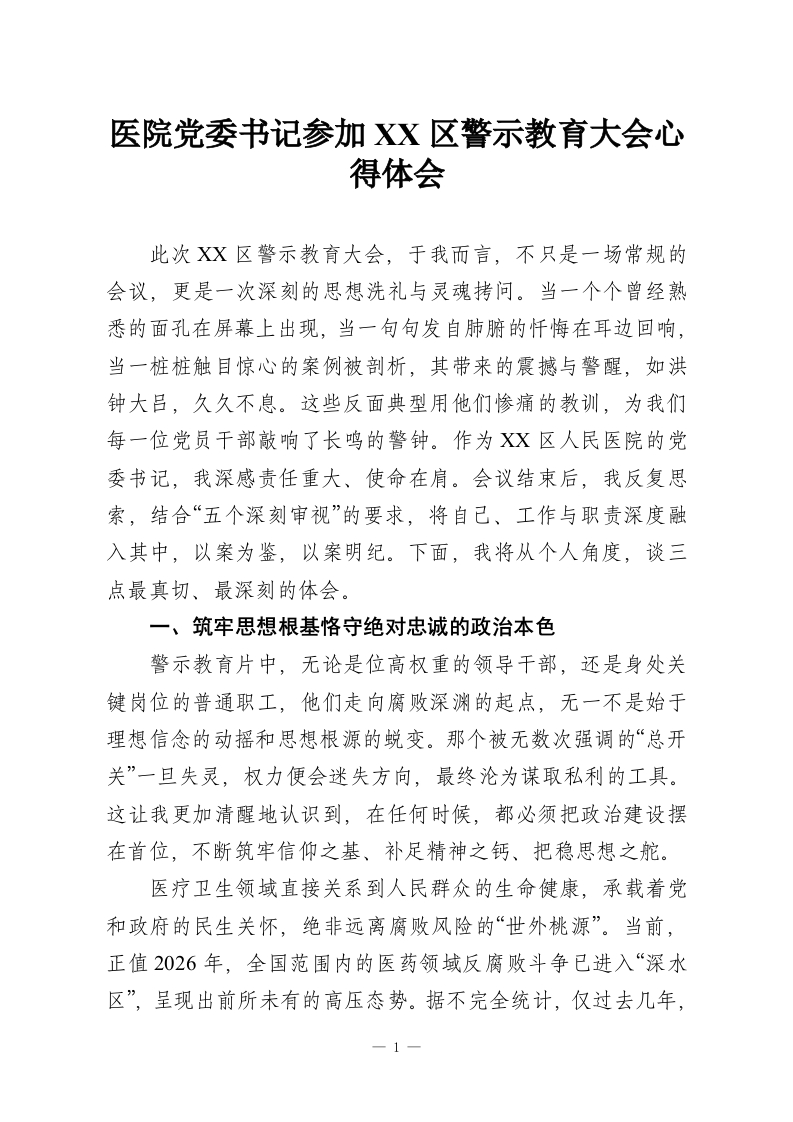 首页精选范文医院党委书记参加XX区警示教育大会心得体会