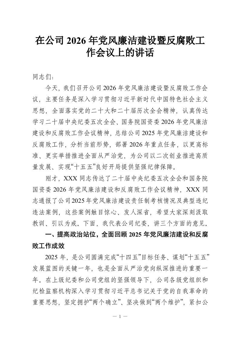 在公司2026年党风廉洁建设暨反腐败工作会议上的讲话
