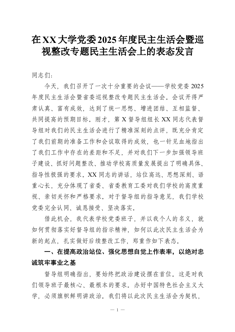 在XX大学党委2025年度民主生活会暨巡视整改专题民主生活会上的表态发言
