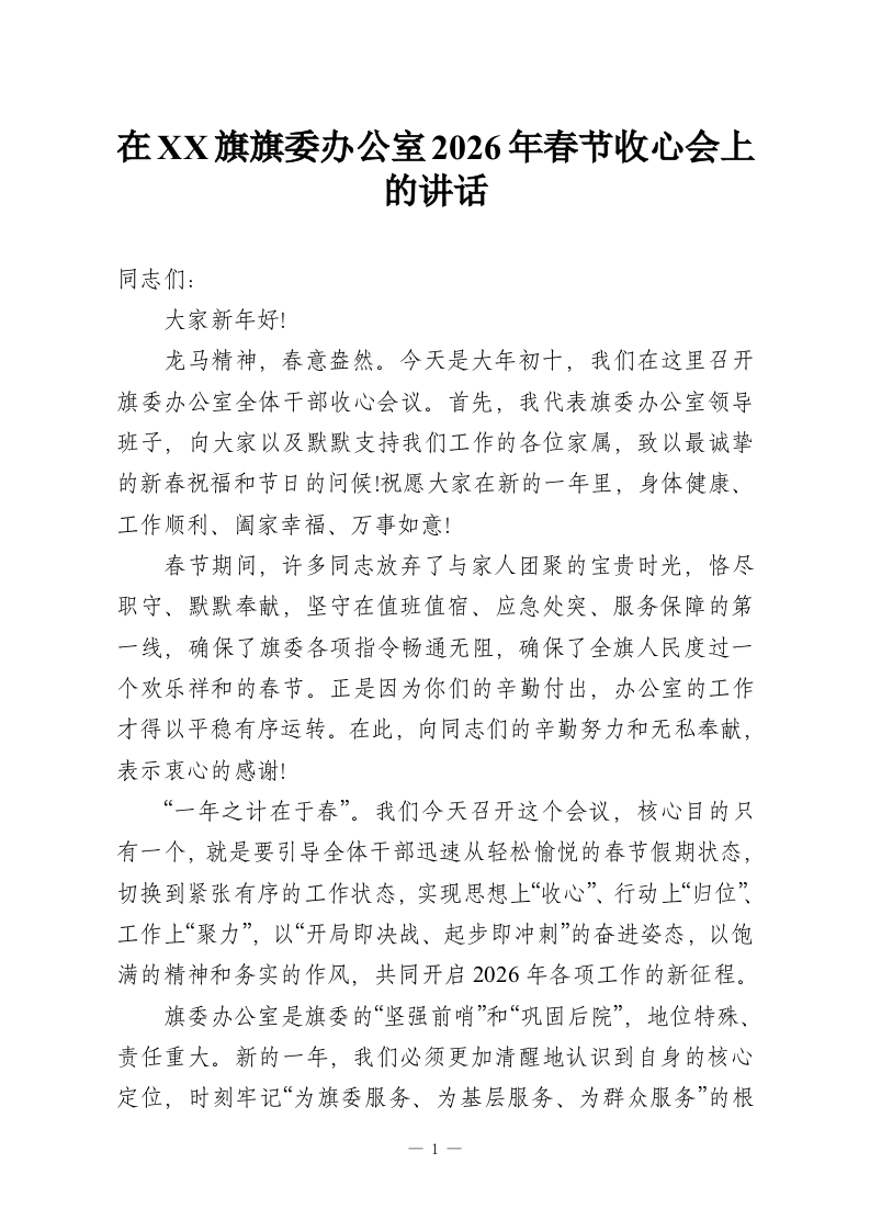 在XX旗旗委办公室2026年春节收心会上的讲话