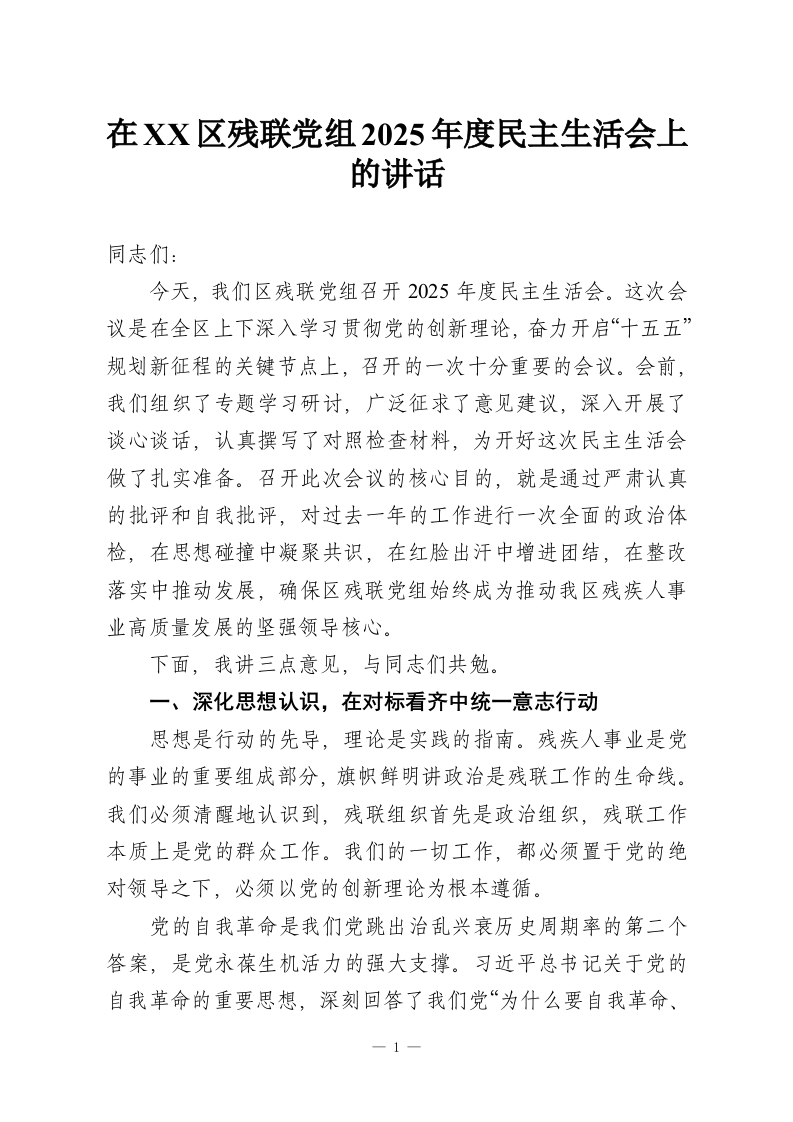 在XX区残联党组2025年度民主生活会上的讲话