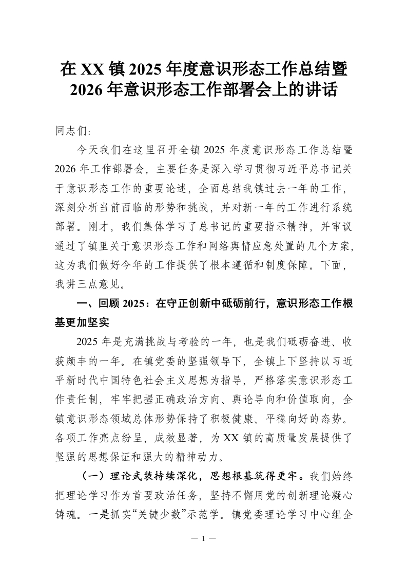 在XX镇2025年度意识形态工作总结暨2026年意识形态工作部署会上的讲话