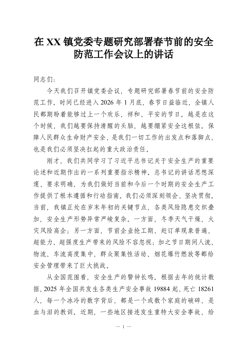 在XX镇党委专题研究部署春节前的安全防范工作会议上的讲话