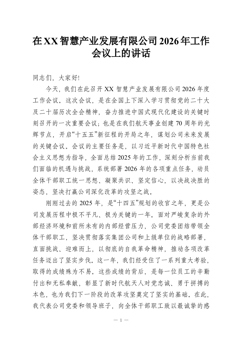 在XX智慧产业发展有限公司2026年工作会议上的讲话
