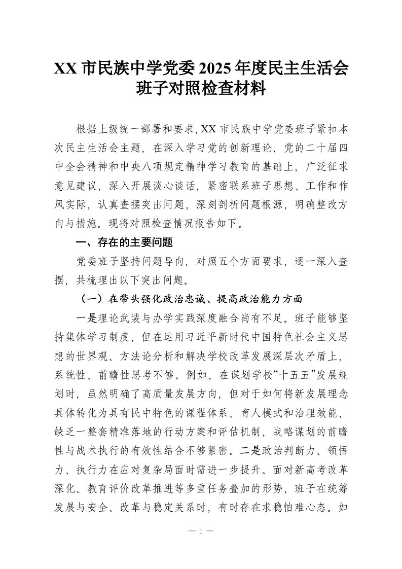 首页精选范文XX市民族中学党委2025年度民主生活会班子对照检查材料