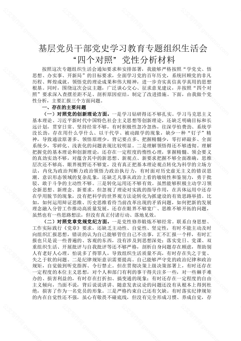 首页工作文档基层党员干部党史学习教育专题组织生活会“四个对照”党性分析材料