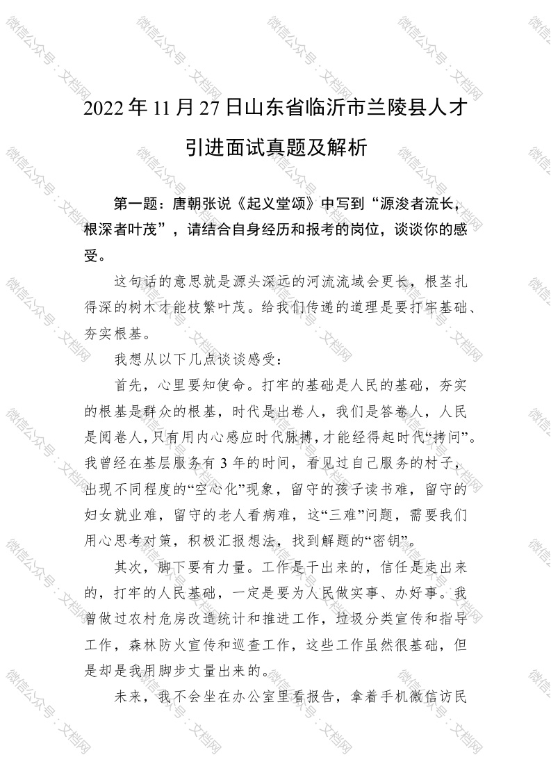 2022年11月27日山东省临沂市兰陵县人才引进面试真题及解析