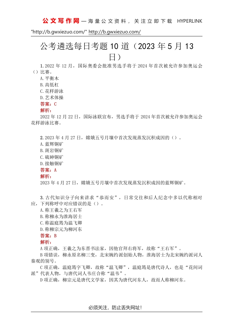 公文写作网一海量公文资料,关注立即下载HYPERLINK"http://b.gwxiezuo.com/"http://b.gwxiezuo.com/公考遴选每日考题10道(2023年5月13日)1.2022年12月,国际奥委会批准男选手将于2024年首次被允许参加奥运会()比赛。A.平衡木B.高低杠C.花样游泳D.艺术体操答案:C解析:2022年12月22日,国际泳联宣布,男选手将于2024年首次被允许参加奥运会花样游泳比赛。2.2023年4月27日,嫦娥五号月壤中首次发现蒸发沉积成因的()。A.蓝辉铜矿B.斑岩铜矿C.硫砷铜矿D.接触铜矿答案:A解析:2023年4月27日,嫦娥五号月壤中首次发现蒸发沉积成因的蓝辉铜矿。3.古代知识分子向来讲求“恭而安”,日常交往和后人纪念中多以代称相对应,下列称呼中对应错误的是()。A.称王羲之为王右军B.称柳永为淮海居士C.称温庭筠为温飞卿D.称柳宗元为柳河东答案:B解析:A项正确,王羲之为东晋书法家,因他官拜右将军,故称“王右军”B项错误,柳永原名柳三变,北宋婉约派创始人物,淮海居士为北宋婉约派词人秦观的别号。C项正确,温庭筠字飞卿,故称“温飞卿”,温庭筠是唐代诗人,也是“花间词派”代表人物,与唐代词人韦庄合称“温韦”。D项正确,柳宗元是唐代文学家,因其为唐代河东人,故而人称柳河东。必须关注,防止丢失网址!