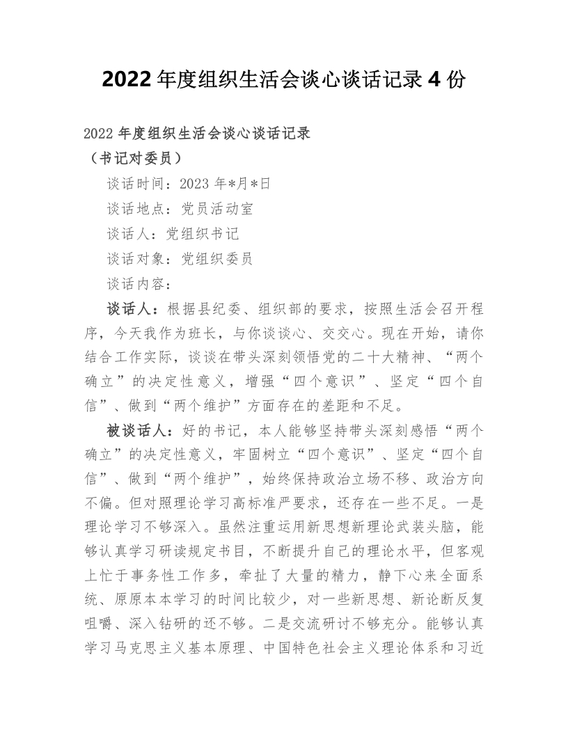 2022年度组织生活会谈心谈话记录4份2022年度组织生活会谈心谈话记录(书记对委员)谈话时间:2023年*月*日谈话地点:党员活动室谈话人:党组织书记谈话对象:党组织委员谈话内容:谈话人:根据县纪委、组织部的要求,按照生活会召开程序,今天我作为班长,与你谈谈心、交交心。现在开始,请你结合工作实际,谈谈在带头深刻领悟党的二十大精神、“两个确立”的决定性意义,增强“四个意识”、坚定“四个自信”、做到“两个维护”方面存在的差距和不足。被谈话人:好的书记,本人能够坚持带头深刻感悟“两个确立”的决定性意义,牢固树立“四个意识”、坚定“四个自信”、做到“两个维护”,始终保持政治立场不移、政治方向不偏。但对照理论学习高标准严要求,还存在一些不足。一是理论学习不够深入。虽然注重运用新思想新理论武装头脑,能够认真学习研读规定书目,不断提升自己的理论水平,但客观上忙于事务性工作多,牵扯了大量的精力,静下心来全面系统、原原本本学习的时间比较少,对一些新思想、新论断反复咀嚼、深入钻研的还不够。二是交流研讨不够充分。能够认真学习马克思主义基本原理、中国特色社会主义理论体系和习近